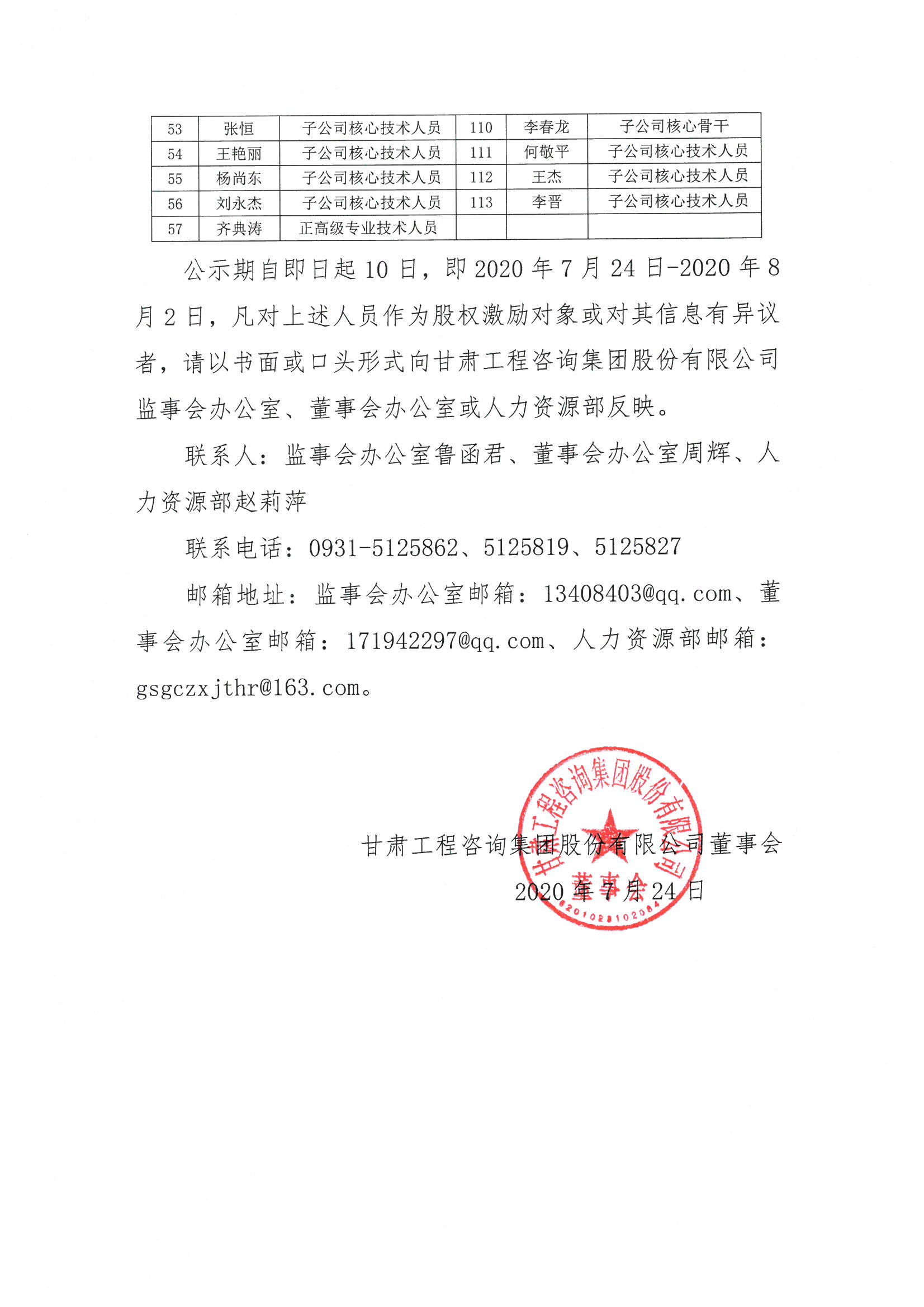 甘肅工程咨詢集團股份有限公司2019年股票激勵計劃預留股份擬授予名單